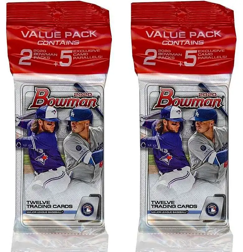 24 cards per pack. Each Value Pack contains two (2) 12-card 2020 Bowman Baseball foil packs with five (5) exclusive Paper Prospect Parallel cards.