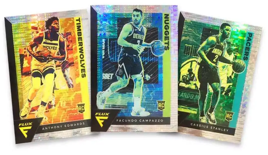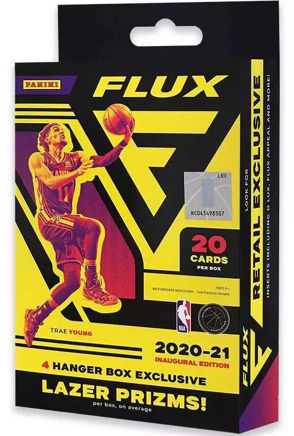Panini presents the 2020-21 Inaugural Edition NBA Flux Hanger Box! Inside this box you will find 20 NBA trading cards. Each box may also contain 4 Hanger Box exclusive Lazer Prizms, on average! Be on the look out for retail exclusive inserts including D Lux, Flux Appeal and more! In addition, look for Flux Signatures & Flux Rookie signatures! Content may vary.