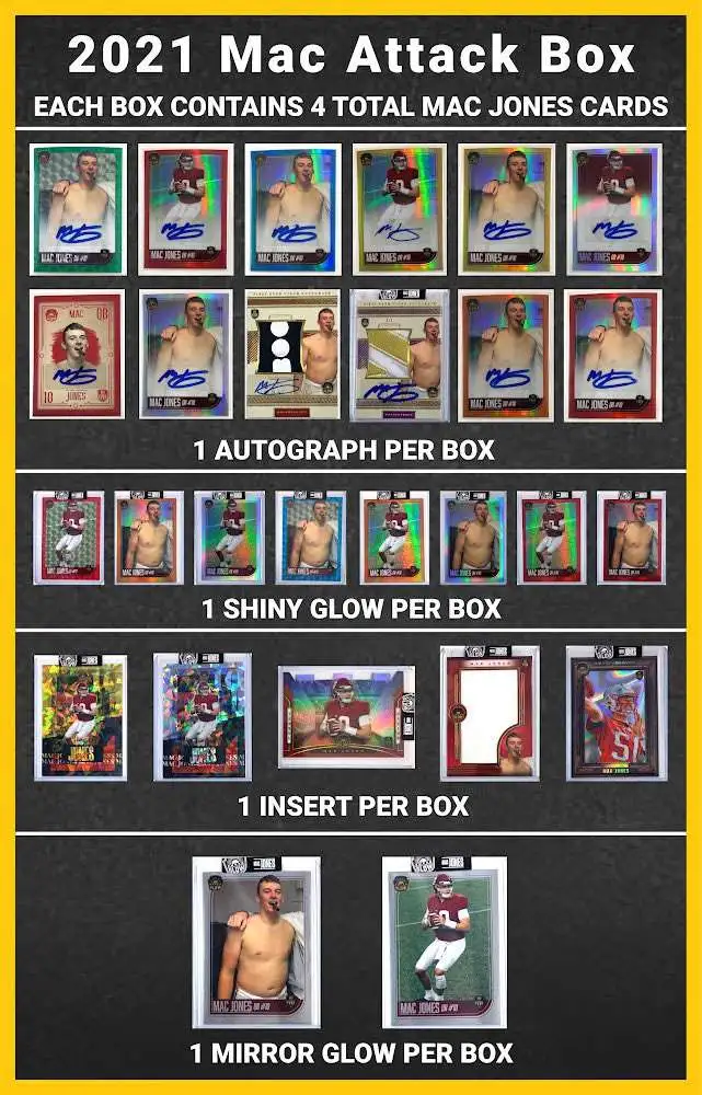 Contains 4 Mac Jones Cards. 1 Autograph Per Box.
