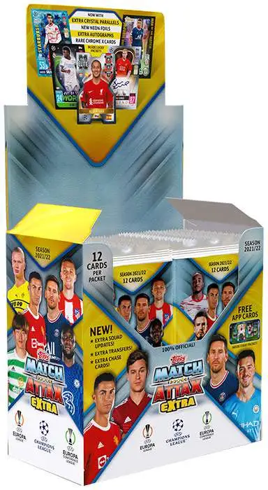 Match Attax Extra is back for 2022! The collection features 299 cards with all the latest squad updates, 100 Club, Crystal Parallels, Neon Foil Mega Value and Out of this World cards, Stars of 2021, Topps Heritage MOTM and an unbeatable 101 card! Look out for Gold and Scan X Limited Edition cards, New 100 Club Legend cards, die cut Chrome X card plus refractor parallels. Lucky packets also contain Autograph cards and Jersery Relic cards can be found inside lucky Mega Tins.